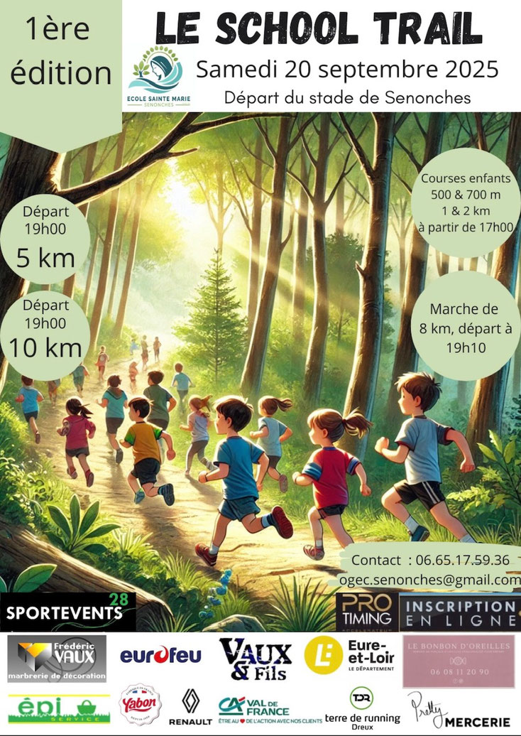 À l’occasion de la 1ère édition du School Trail qui aura lieu le samedi 20 septembre, à partir de 17h, au départ du stade de foot de Senonches, nous lançons un GRAND CHALLENGE entre les classes pour motiver petits et grands à participer 🎉