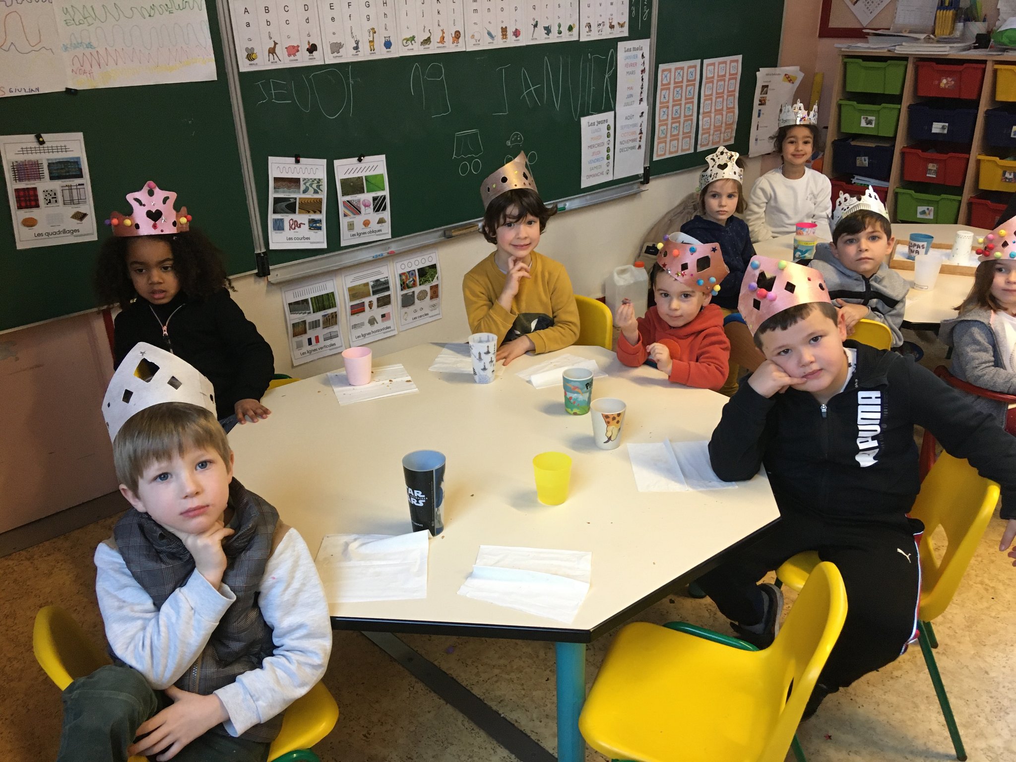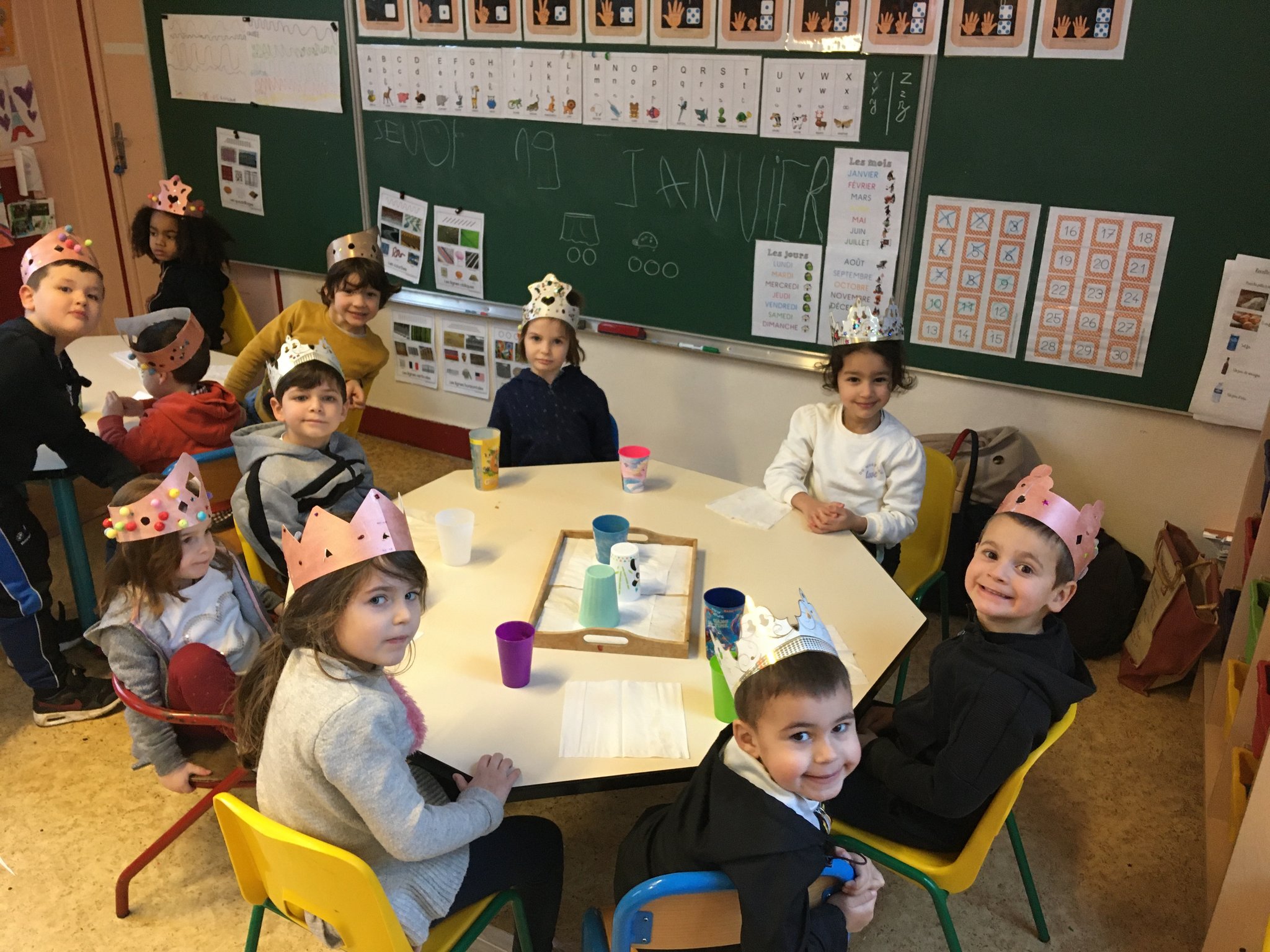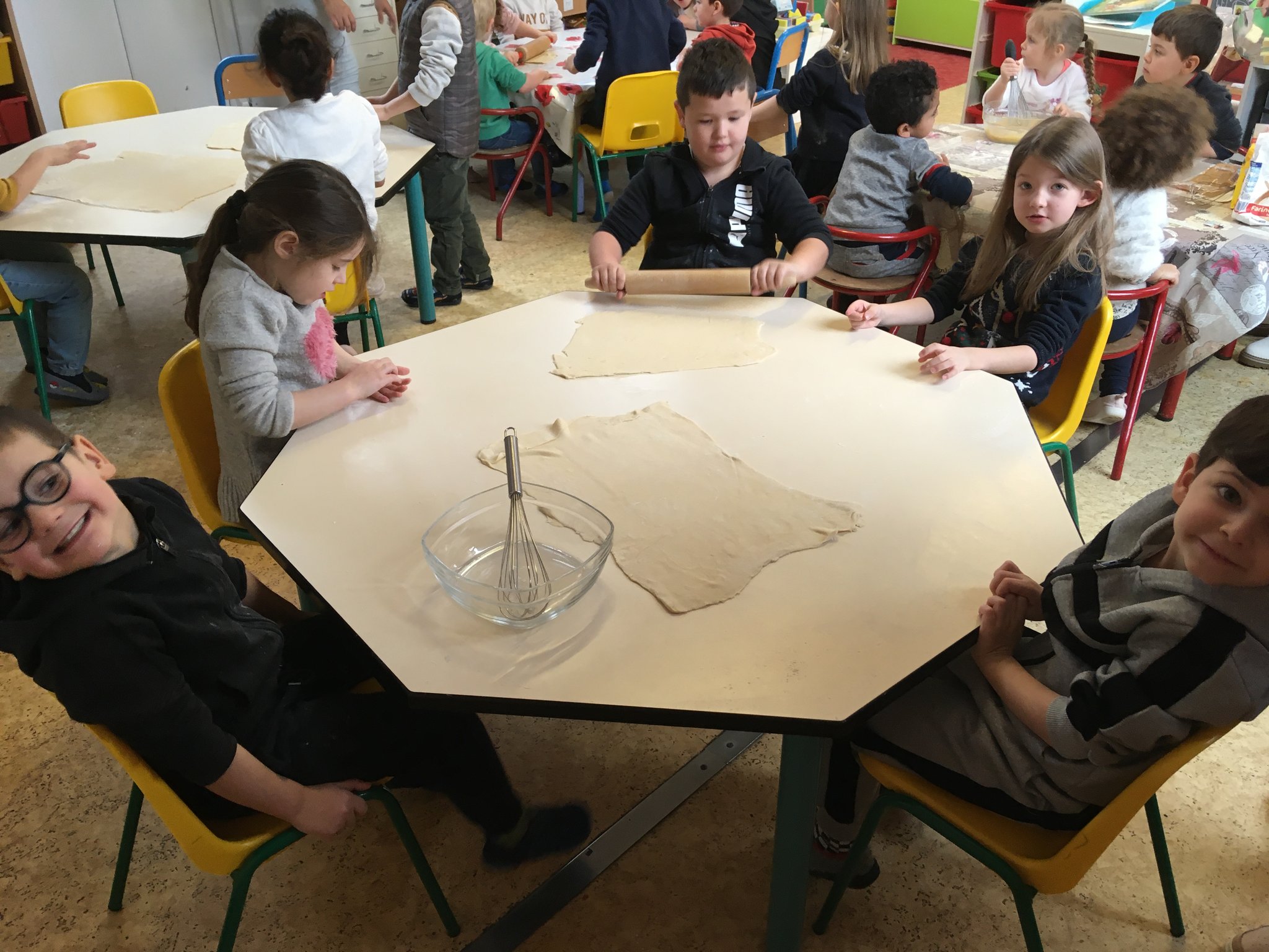 Les enfants de maternelle ont eu le plaisir de mettre la main à la pâte pour confectionner des galettes des rois. La maitresse s'est ensuite enfuie avec pour les manger car elle voulait être la reine de la classe et trouver la fève, heureusement les élèves l'ont rattrapé et ont pu déguster leur part et partager la couronne!