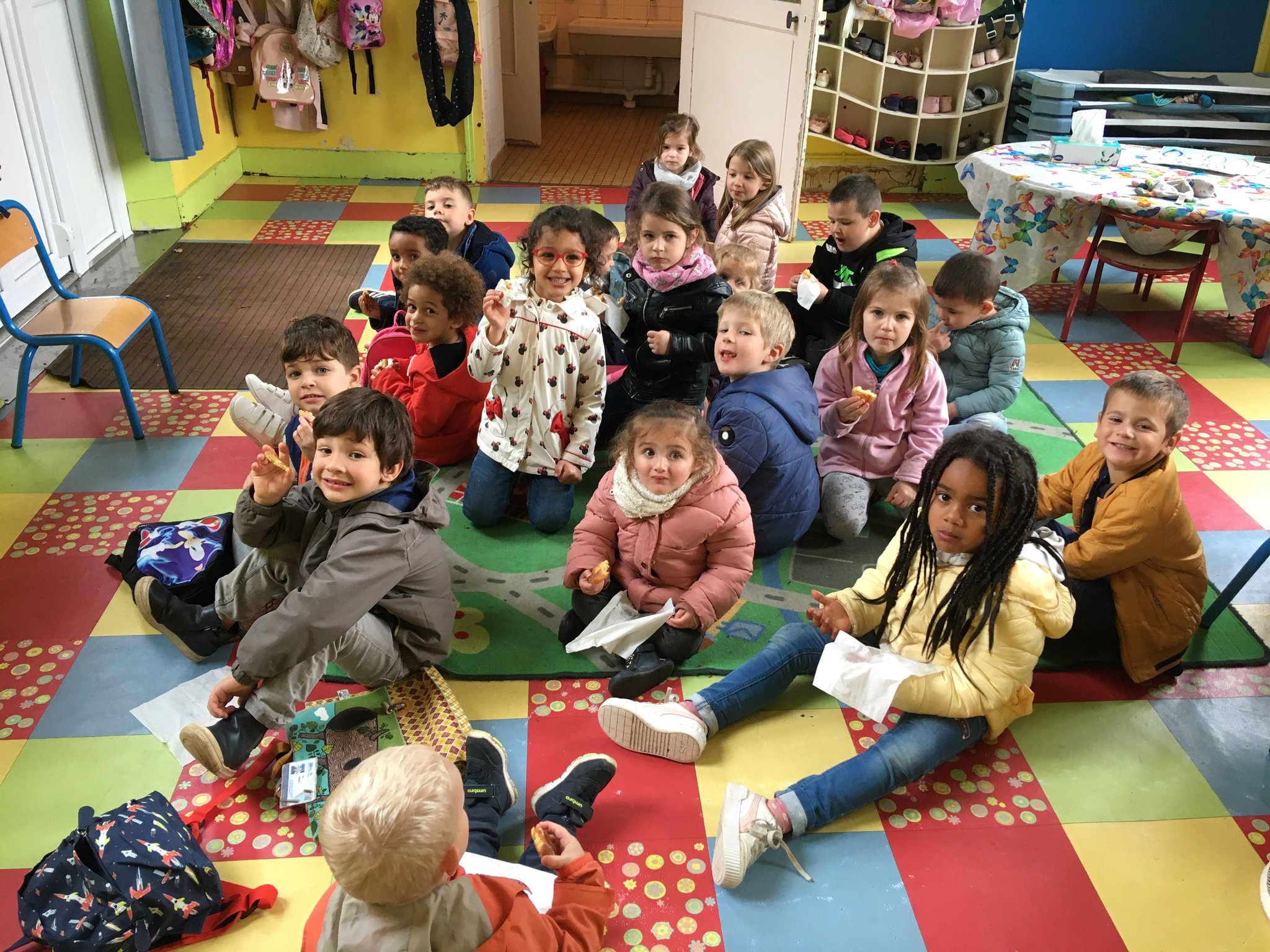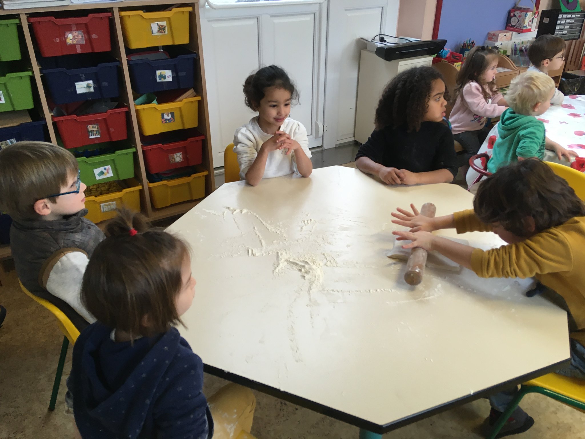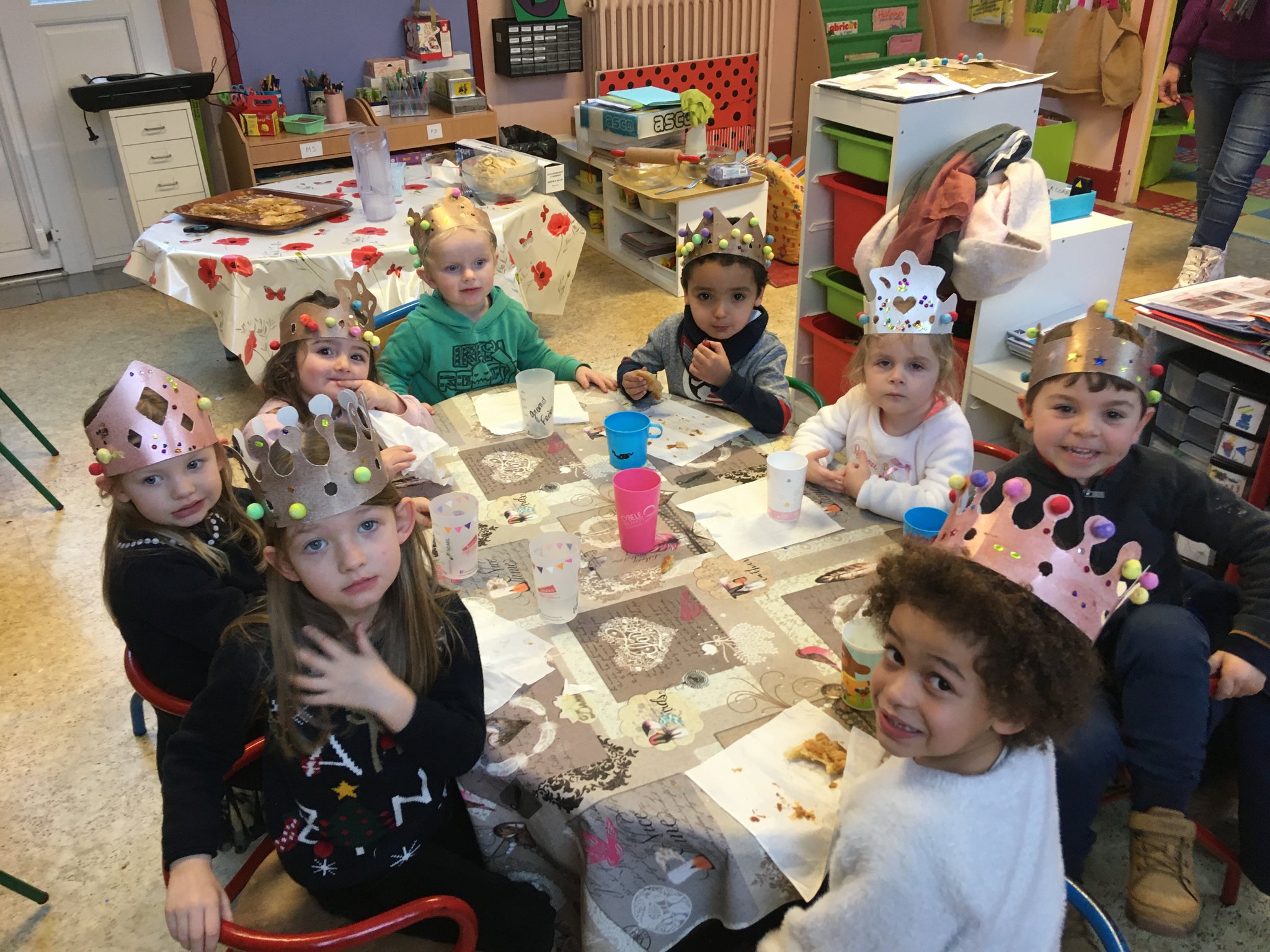 Les enfants de maternelle ont eu le plaisir de mettre la main à la pâte pour confectionner des galettes des rois. La maitresse s'est ensuite enfuie avec pour les manger car elle voulait être la reine de la classe et trouver la fève, heureusement les élèves l'ont rattrapé et ont pu déguster leur part et partager la couronne!